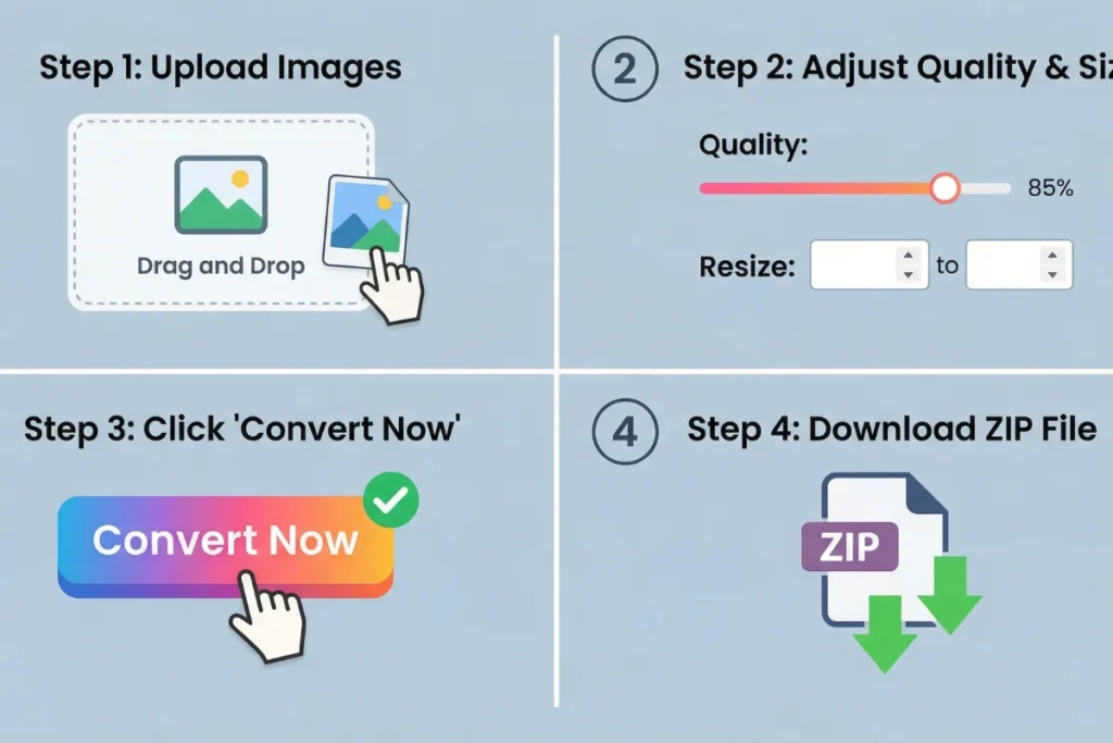 For single images, click Download WebP. For bulk conversions, click Download All as ZIP to receive all of your converted files packaged neatly in one archive, ready to upload to your website’s media library.