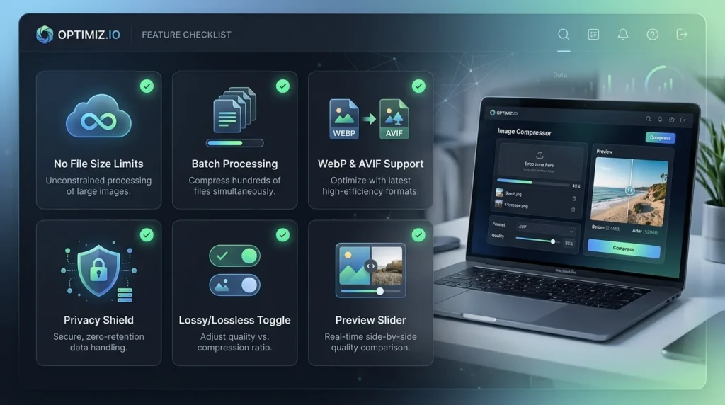 Modern Format Support: Beyond standard JPEGs and PNGs, your chosen free online tools to compress and resize images must support next-gen formats like WebP and AVIF, which offer superior savings for 2026 web standards.