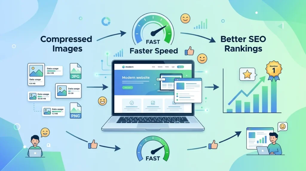 With mobile-first indexing, the mobile performance of your site is the primary factor in your ranking. Heavy images can cripple a mobile user’s experience, especially on slower 4G or 5G connections. Compression resolves this by delivering high-quality visuals at a fraction of the data cost.