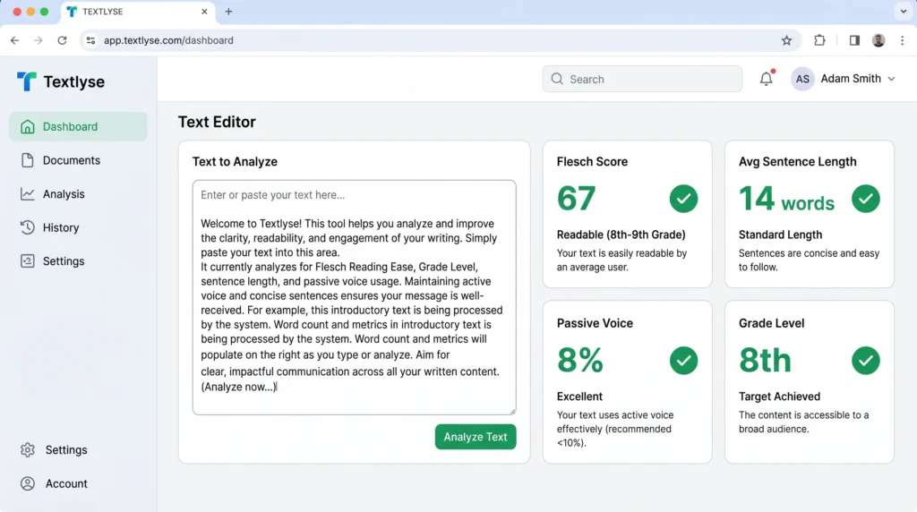 You can’t fix what you don’t measure. The very first thing you should do is paste your content into a Readability Checker Tool. Our free tool analyzes your text instantly and gives you a Flesch reading score, sentence length breakdown, passive voice percentage, and grade level — all in one dashboard.
