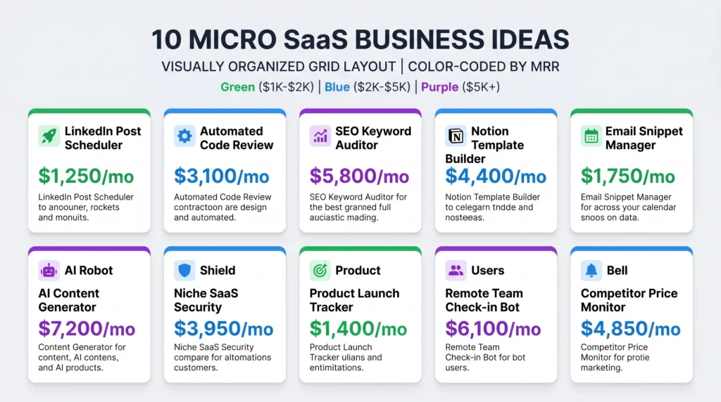 What makes micro SaaS ideas with revenue examples so attractive right now is proof. We’re not talking about theoretical business ideas — we’re talking about solo founders and tiny teams quietly generating $1,000 to $10,000 per month in Monthly Recurring Revenue (MRR), often while working part-time.