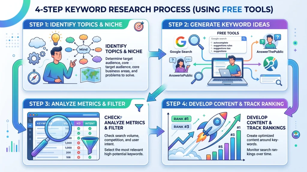 In the next 2500+ words, you’ll learn why free tools work just as well as paid ones for beginners, how to use each of the top 10 free keyword research tools for beginners step-by-step, real-world examples, and pro tips that most guides skip. By the end, you’ll have a complete system to find profitable keywords every single time.